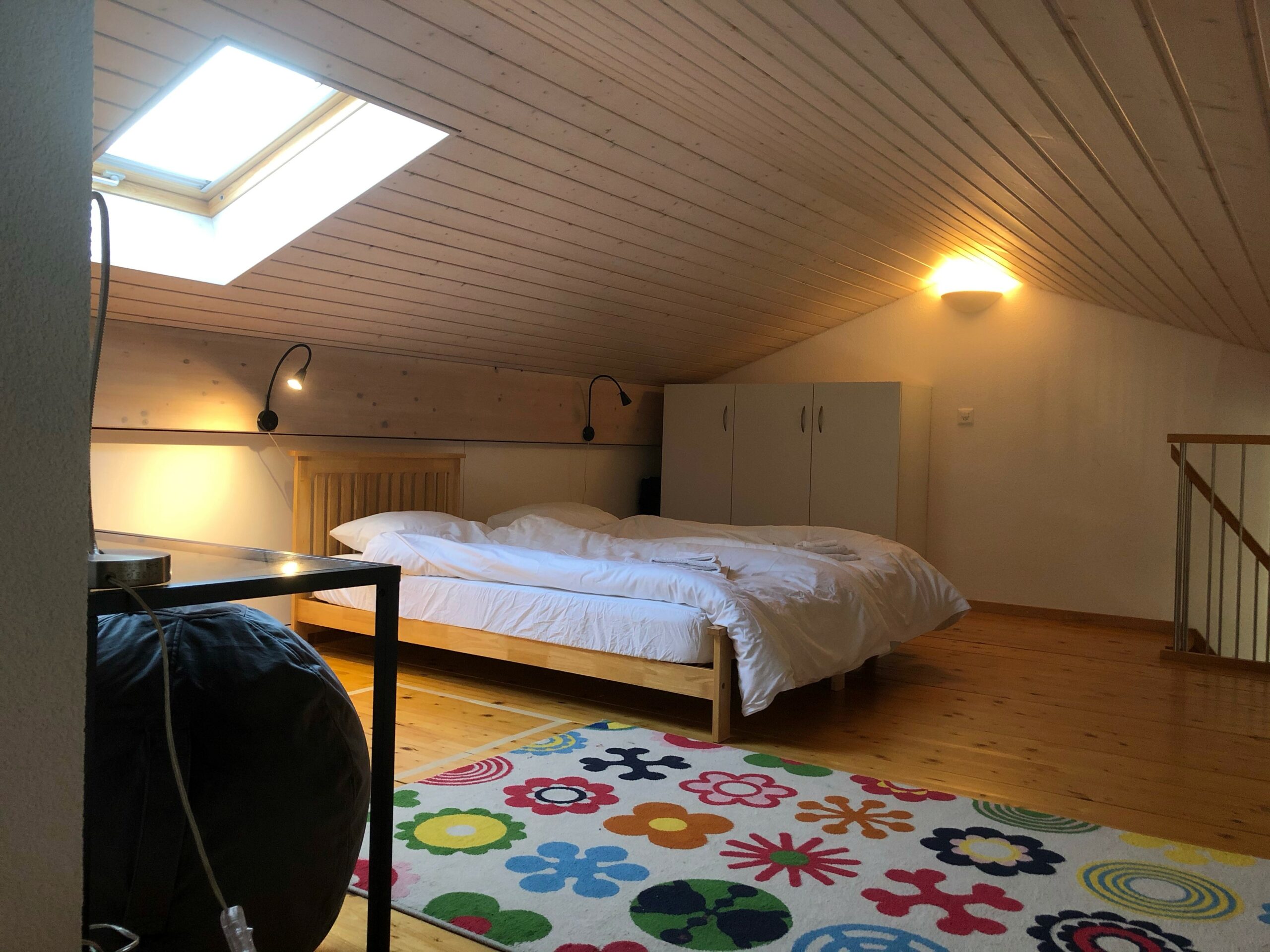 Obergeschoss: abgeschrägte Galerie mit eingeschränkter Stehhöhe. mit 2 Betten (90 cm breit, Länge 190 cm)