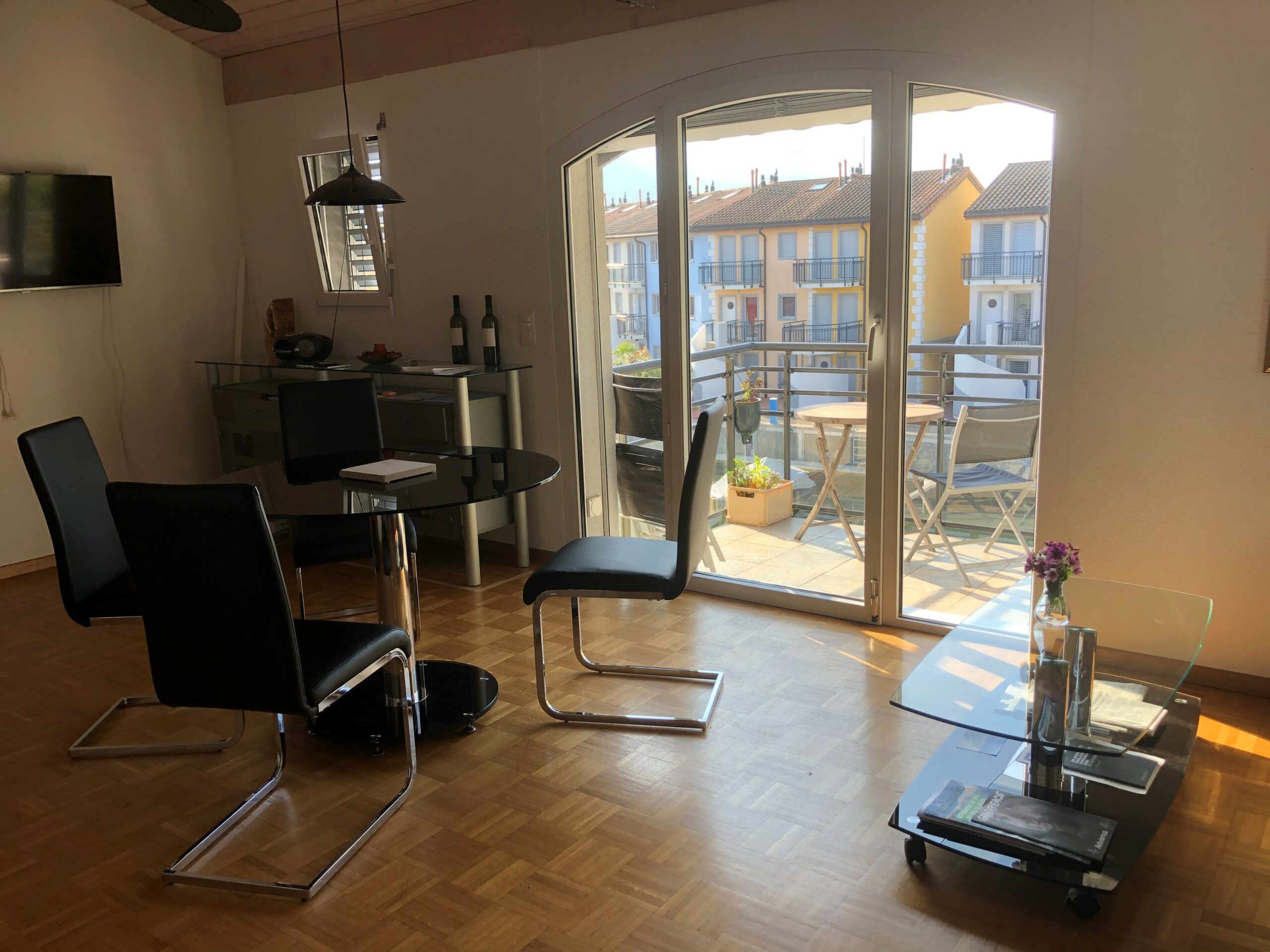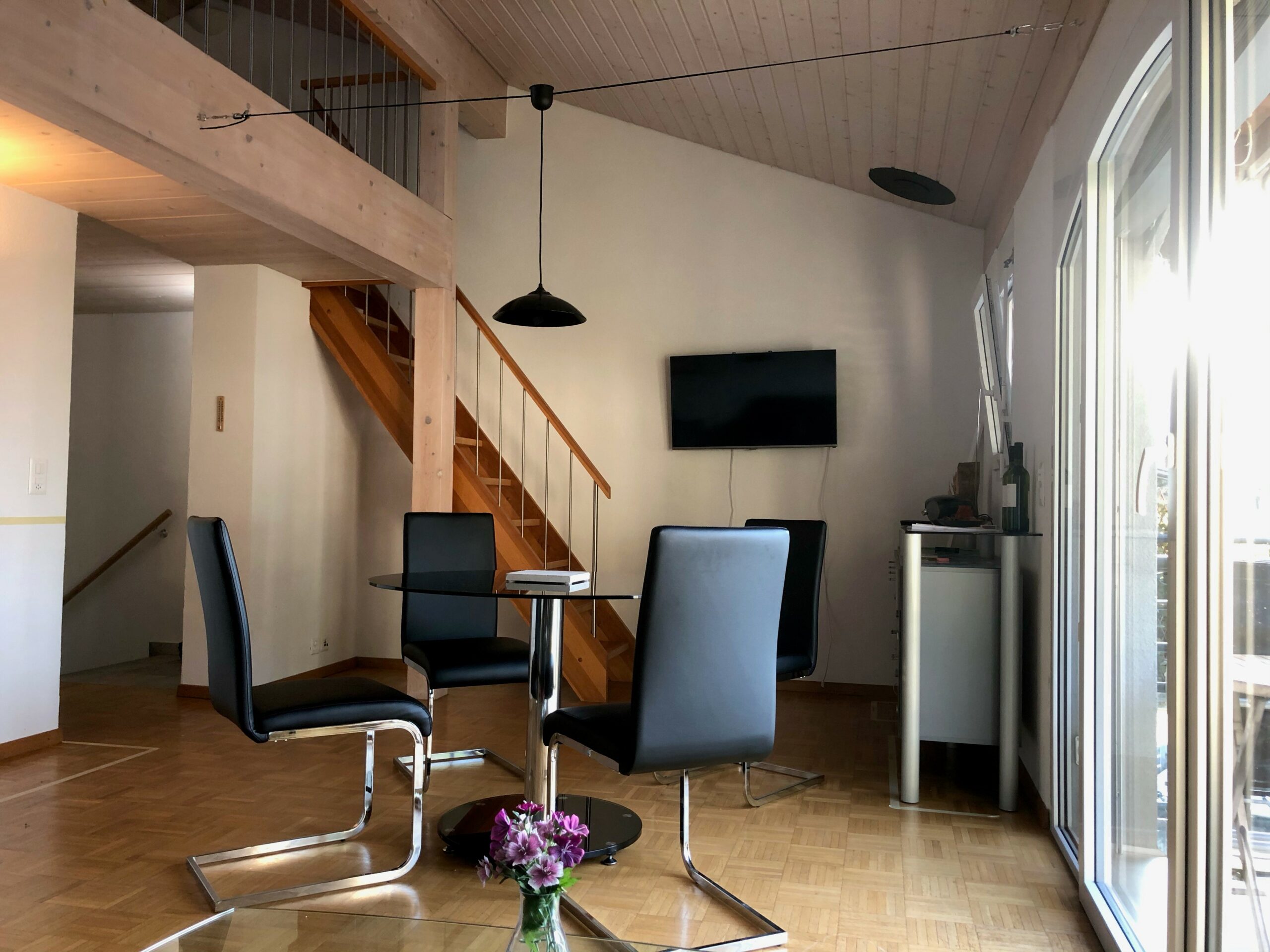 Das Wohnzimmer ist wohnlich eingerichtet mit einem runden Esstisch mit 4 Lederstühlen. Im Glasschrank daneben finden Sie Literatur und Spiele. Ein Schwedenofen und ein Klavier bereichern die Stube. Auch ein Ledersofa und Ledersessel, davor ein kleiner Glastisch sind vorhanden. Von dort können Sie direkt auf den Balkon im Süden gehen und Ihre Mahlzeiten im Freien geniessen. Die Gewürzkräuter auf dem Balkon bereichern Ihre Speisen und sind dankbar für etwas Wasser. Ein TV und CD-Gerät sind vorhanden.